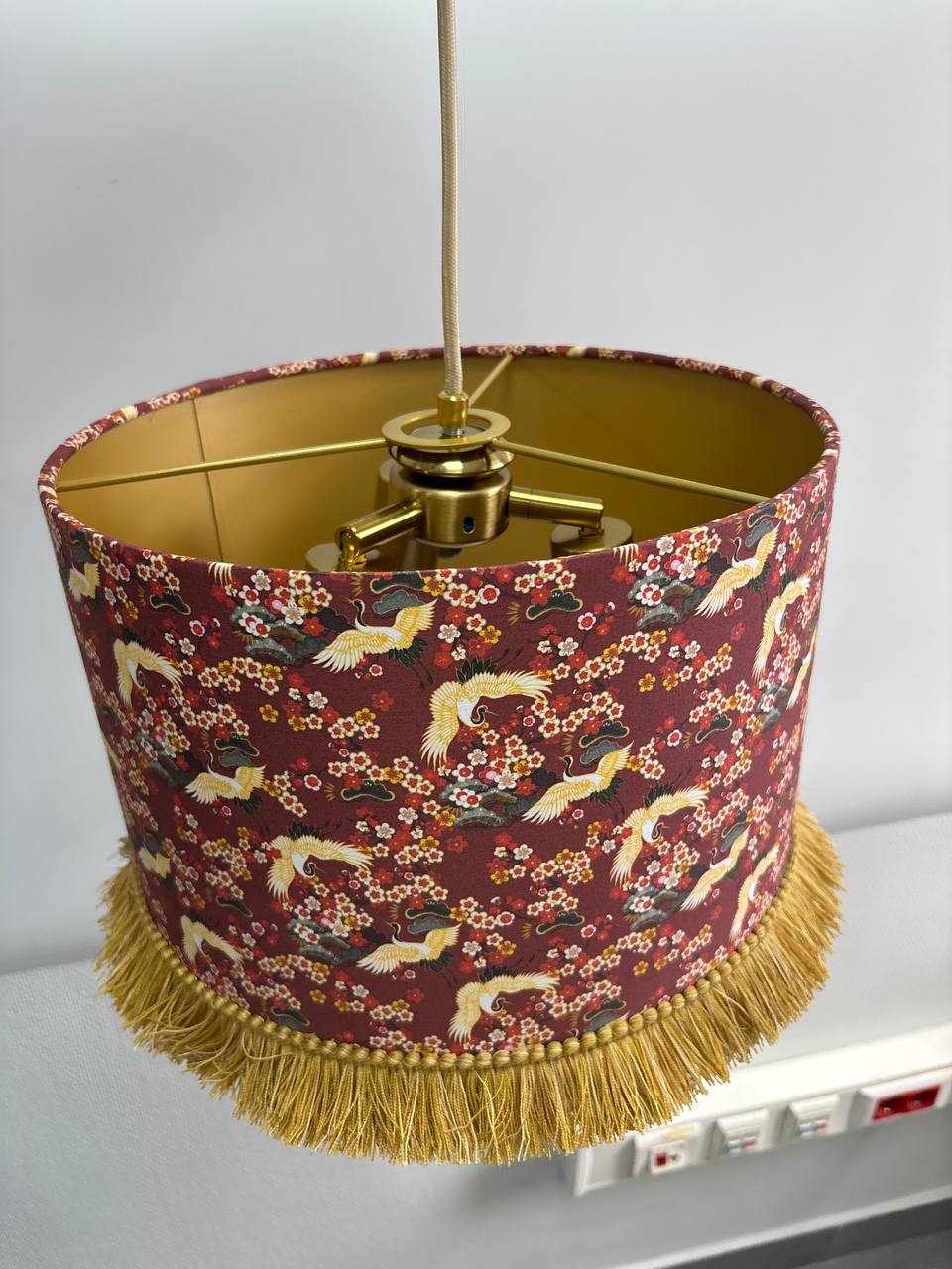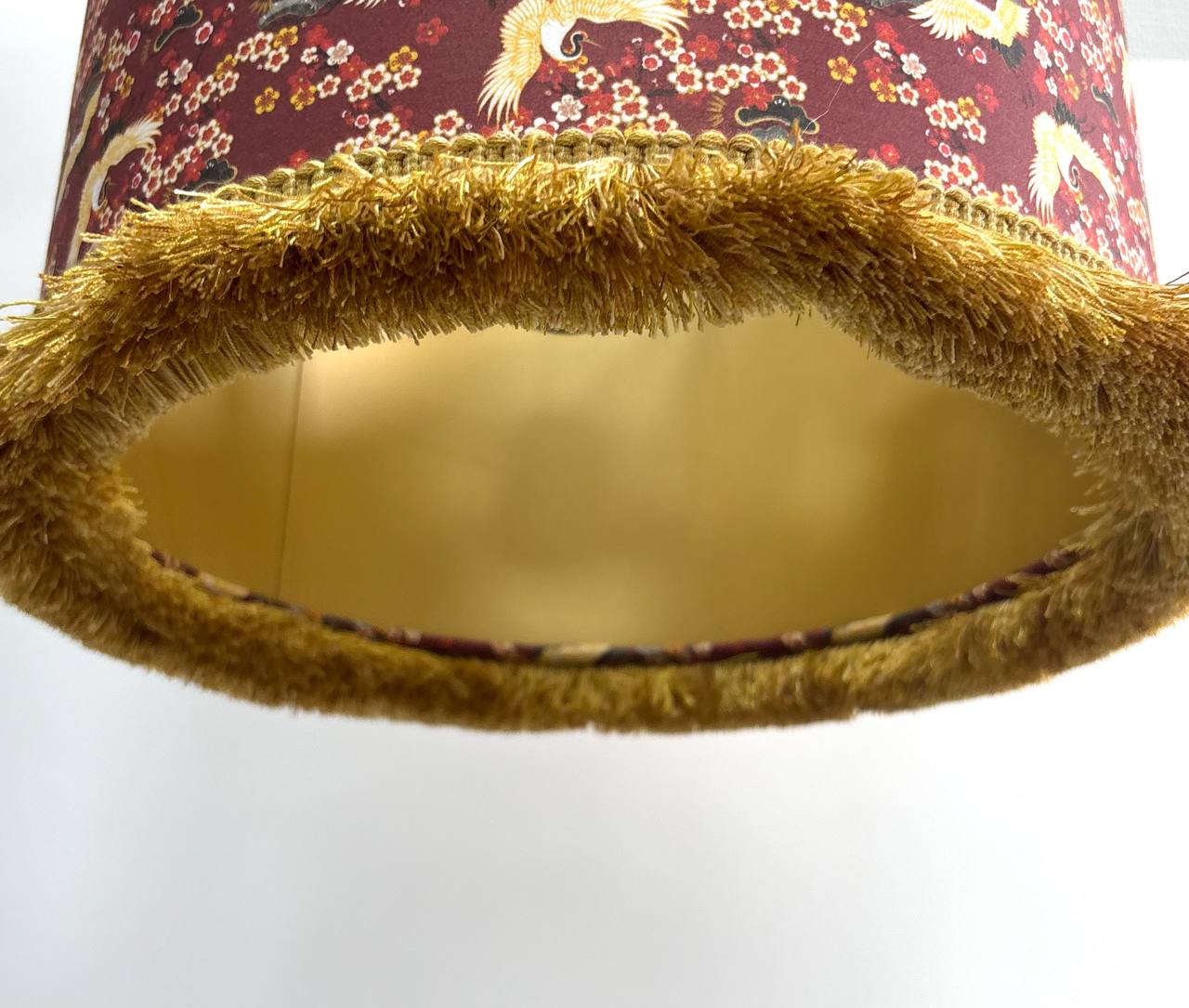 Красивый акцент добавляет золотая бахрома, которая придает абажуру неповторимый шарм и делает его еще более привлекательным.