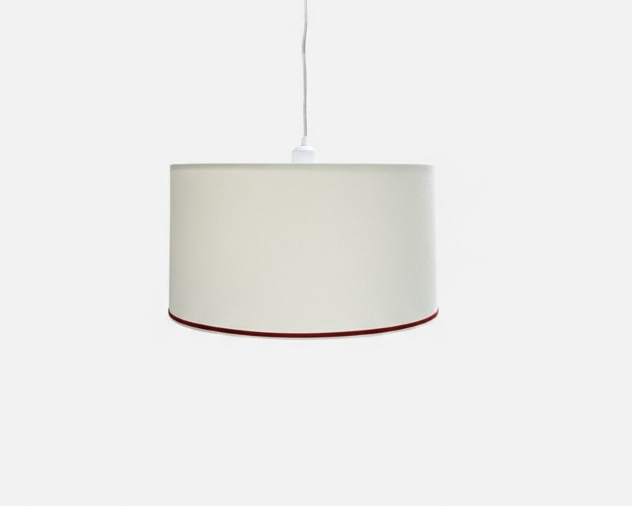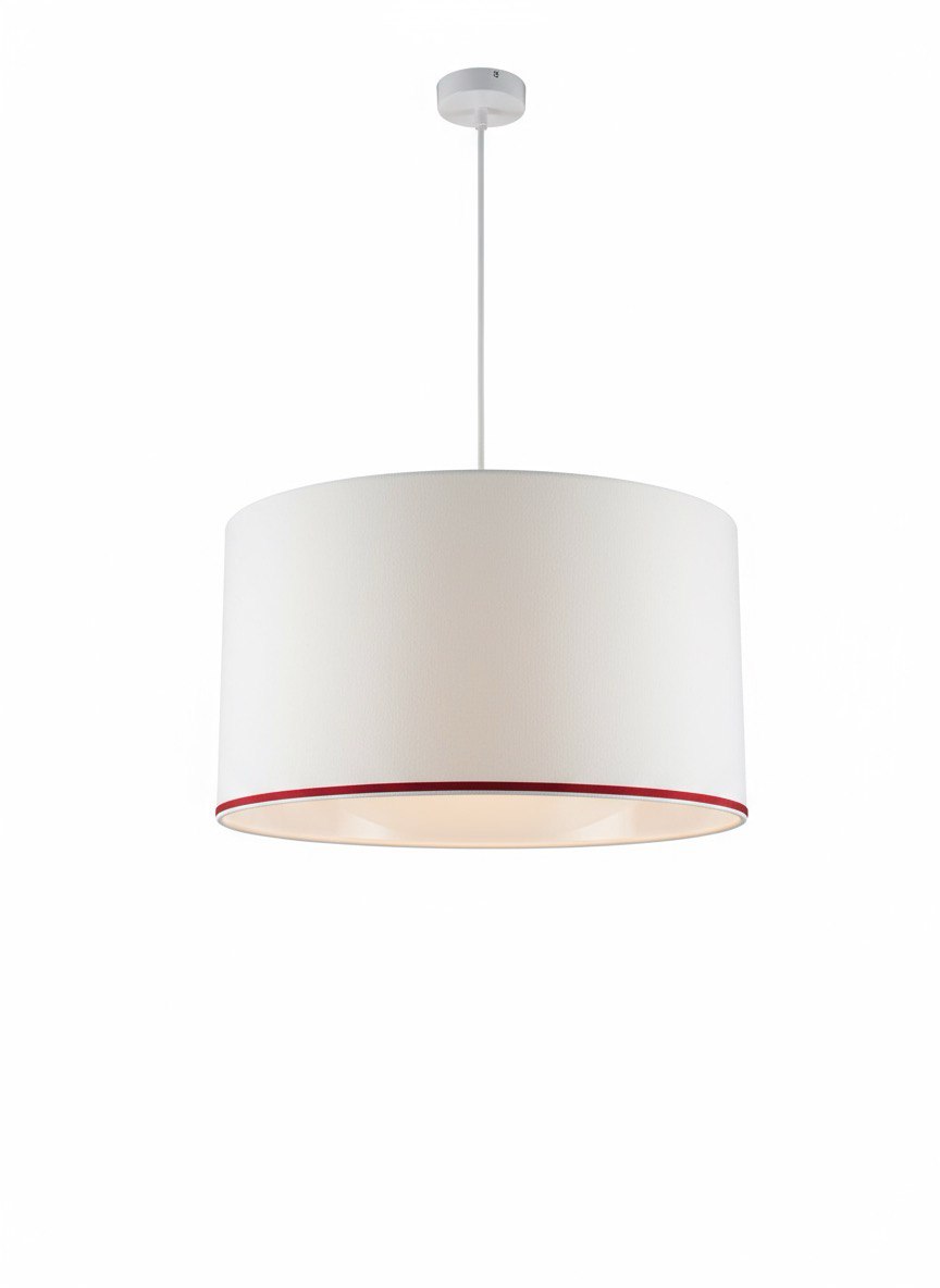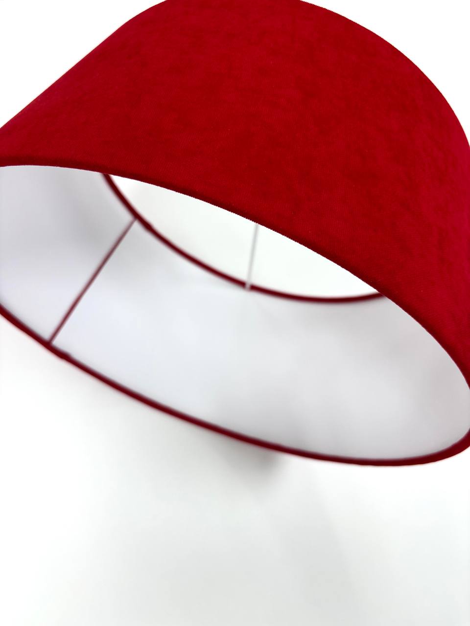 Наружная часть абажура покрыта натуральной хлопковой белого цвета, которая с легкостью пропускает свет, а по нижней части абажур украшен тонкой красной бархатной лентой.
