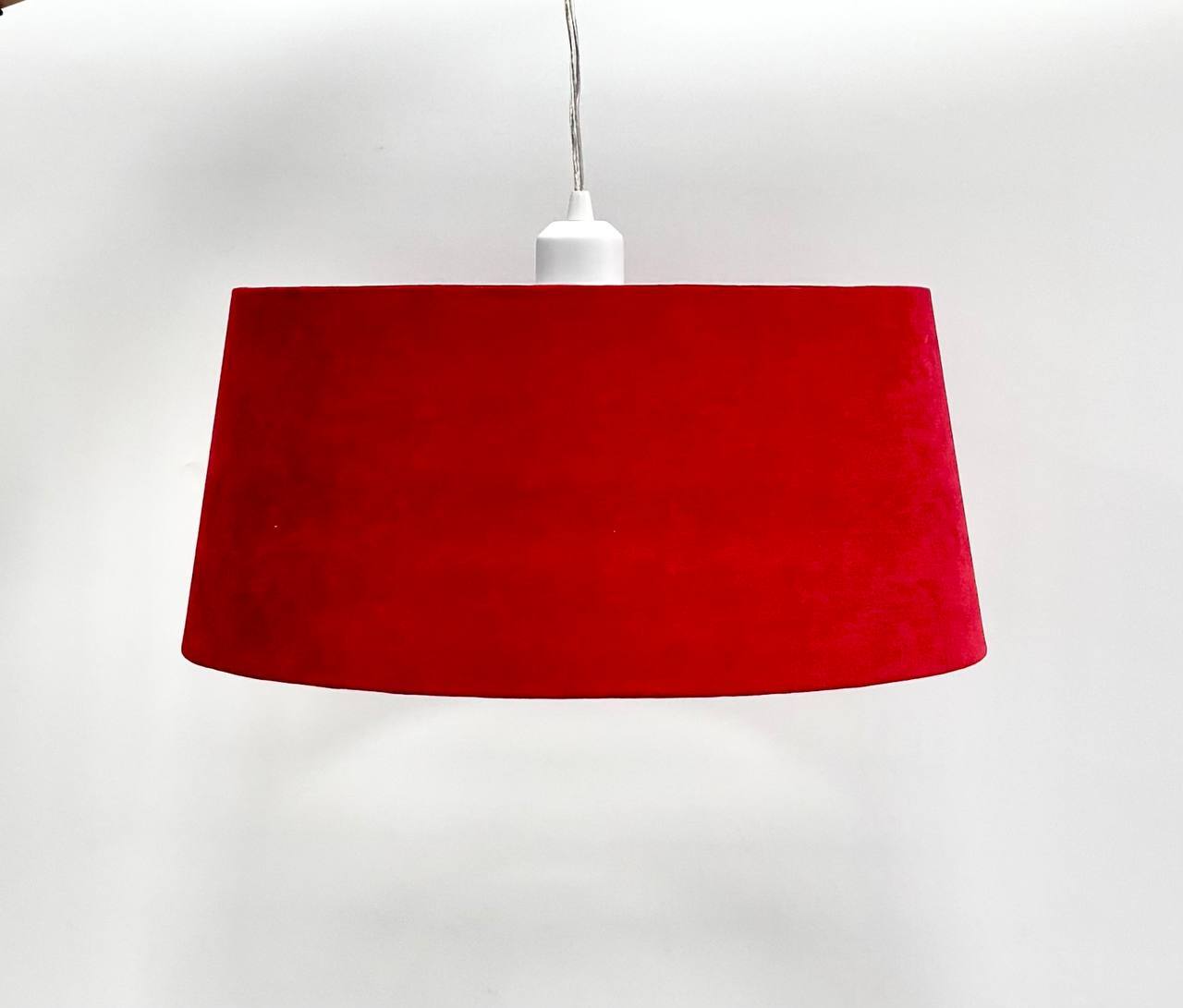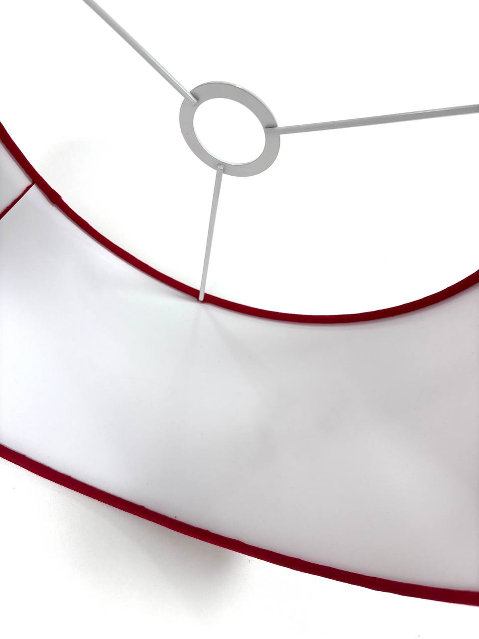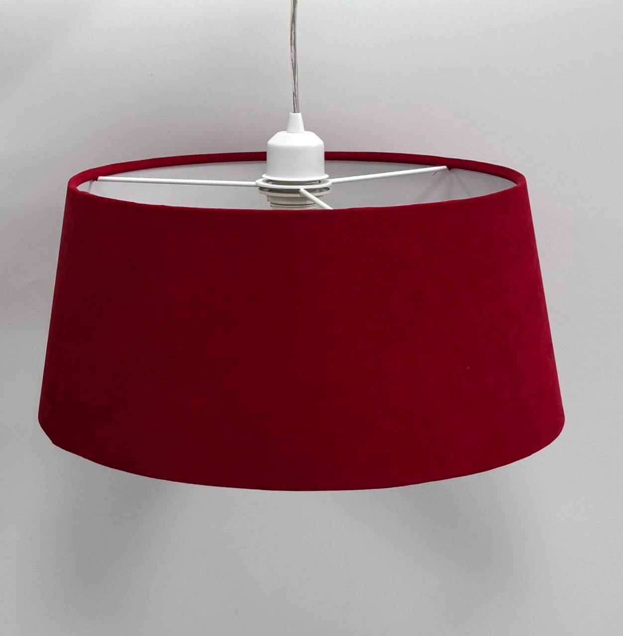 Наружная часть абажура покрыта натуральной хлопковой белого цвета, которая с легкостью пропускает свет, а по нижней части абажур украшен тонкой красной бархатной лентой.