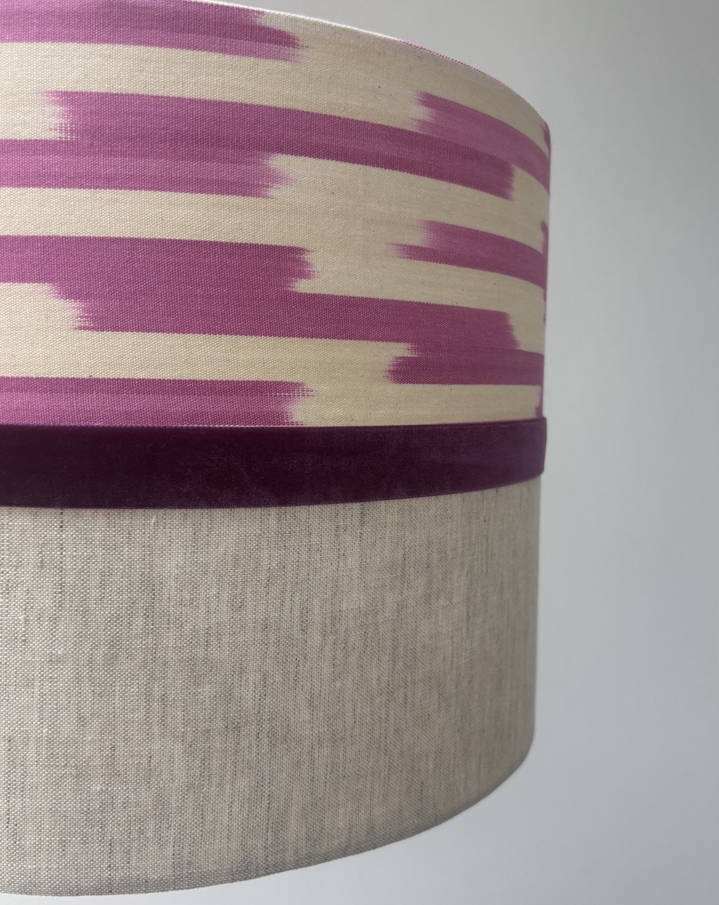 Абажур из двух видов ткани (лен+икат) с бархатной тесьмой цвета фуксии. Может использоваться как для настольной, так и подвесной лампы.