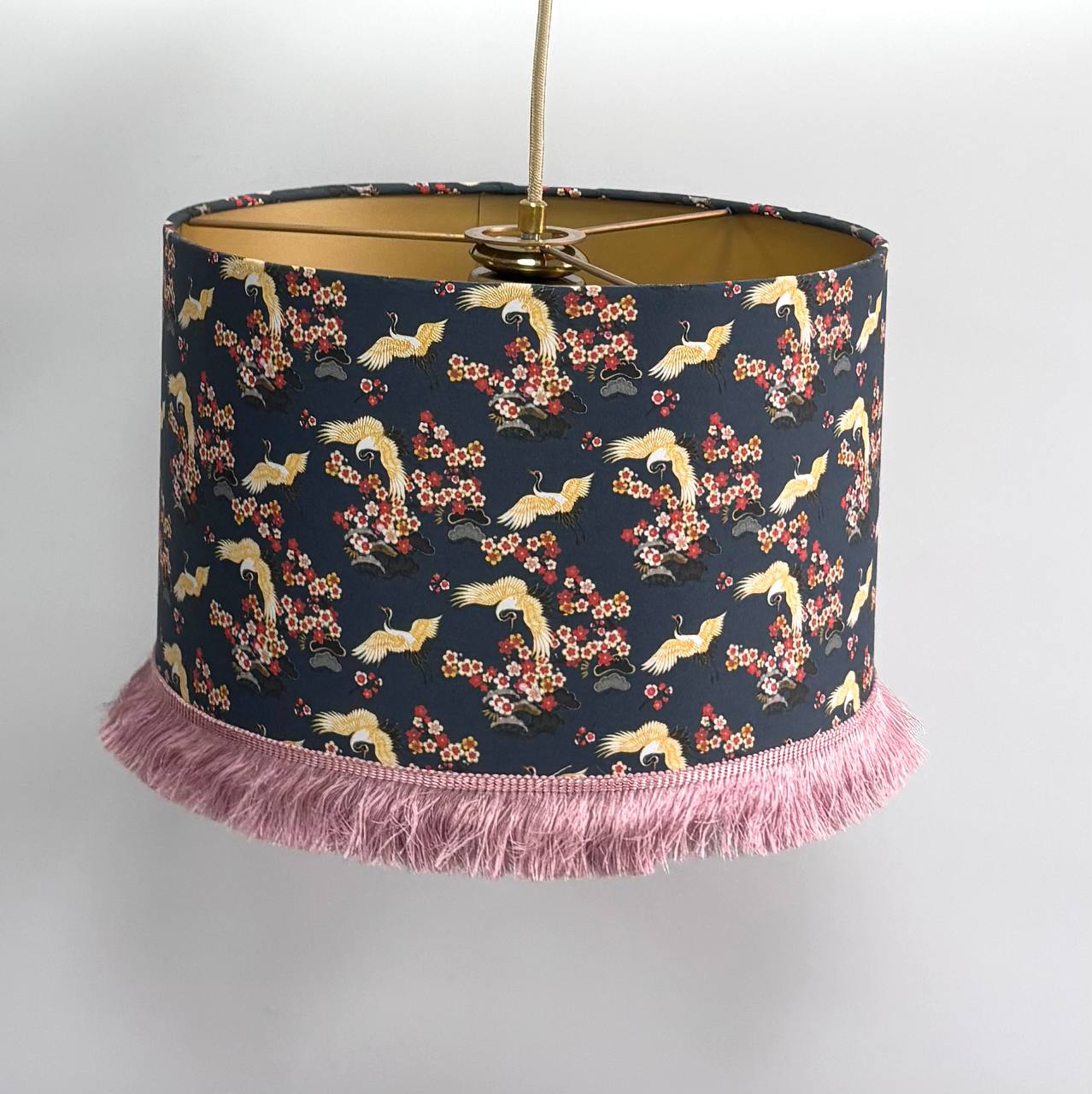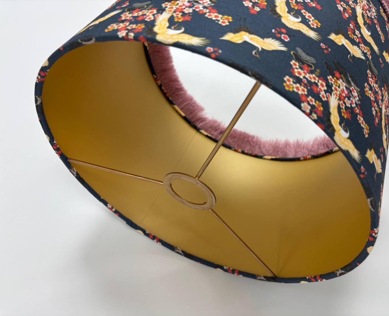 Наружная часть абажура покрыта натуральной хлопковой тканью, которая прекрасно подсвечивает принт, поэтому при включенном свете выглядит действительно атмосферно. Внутренняя часть абажура выполнена в золотом цвете, что обеспечивает равномерное, теплое распределение света.