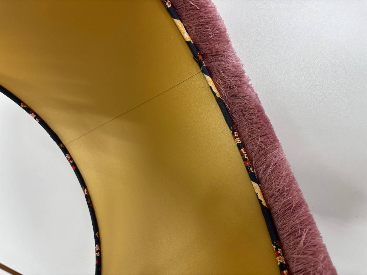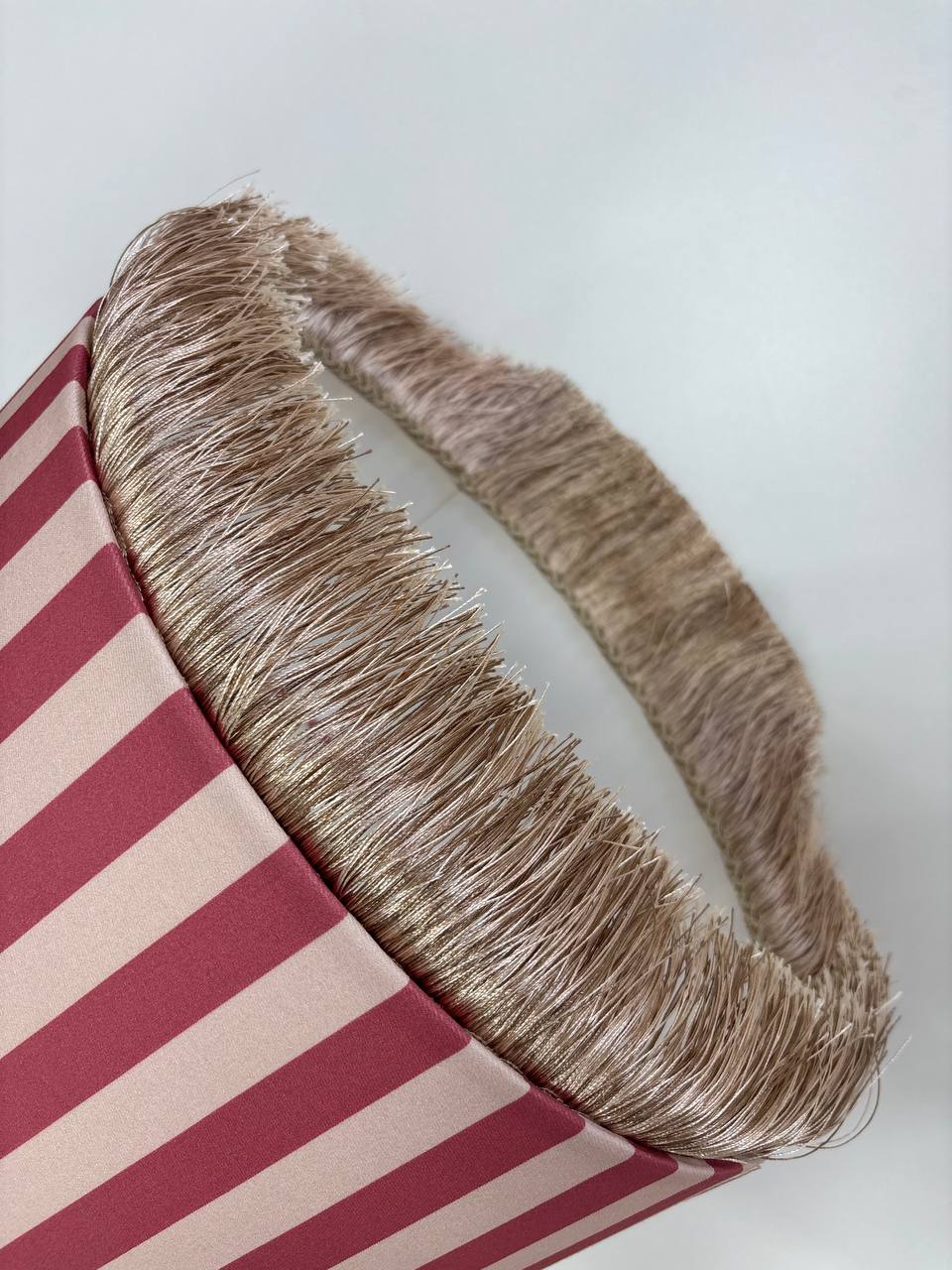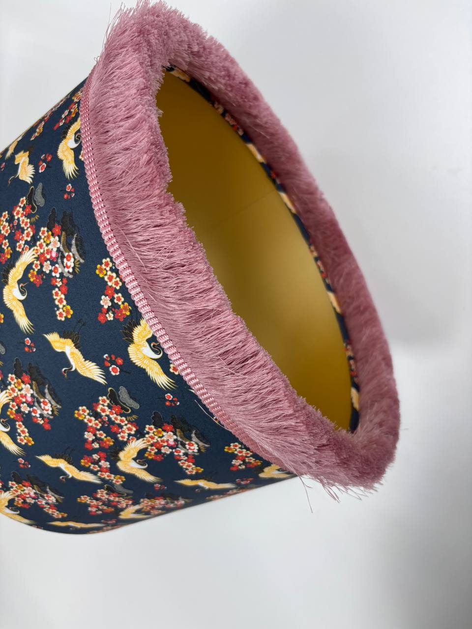 Красивый акцент добавляет розовая бахрома, которая придает абажуру неповторимый шарм и делает его еще более привлекательным.