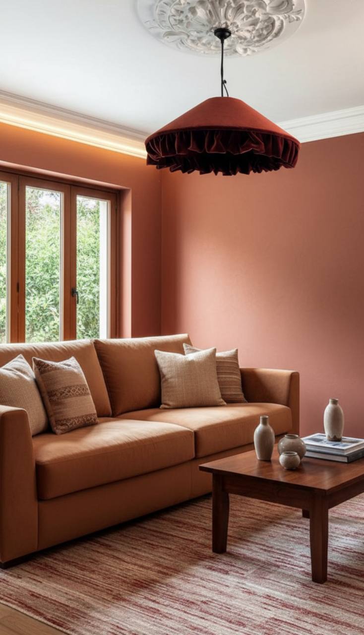 Подвесной абажур из терракотового бархата с хлопковой бахромой/рюшами. Не обычная форма в сочетании с текстурой бархата придает абажуру действительно эксклюзивный вид.