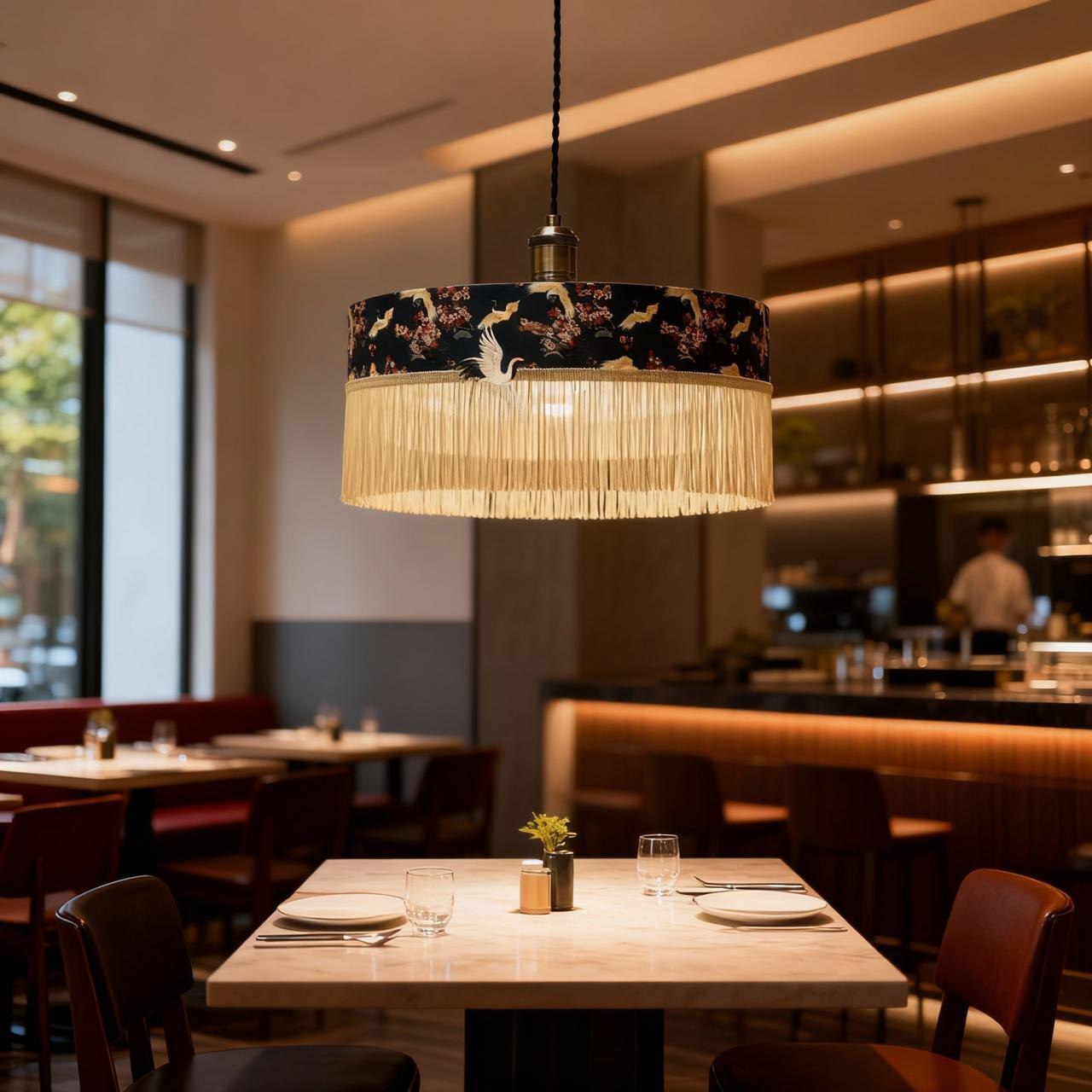 * Освещение: лучше всего абажур будет смотреться при мягком, рассеянном свете. * Комбинации: сочетайте с другими элементами стиля — фарфоровыми вазами, шёлковыми тканями, лакированной мебелью. * Масштаб: выбирайте размер абажура в соответствии с габаритами помещения и высотой потолка.